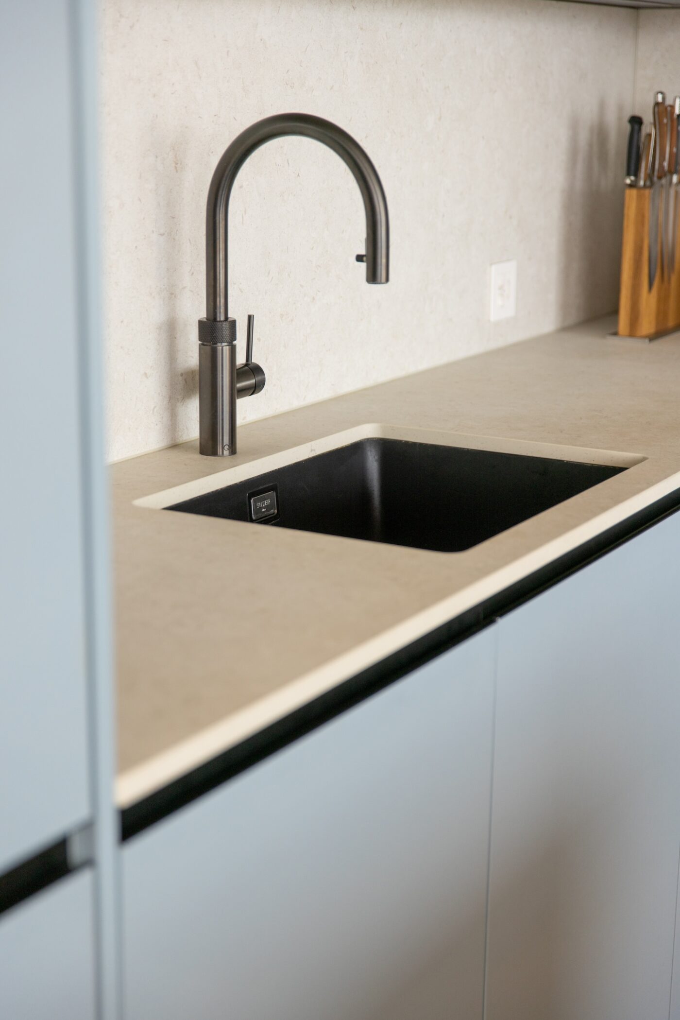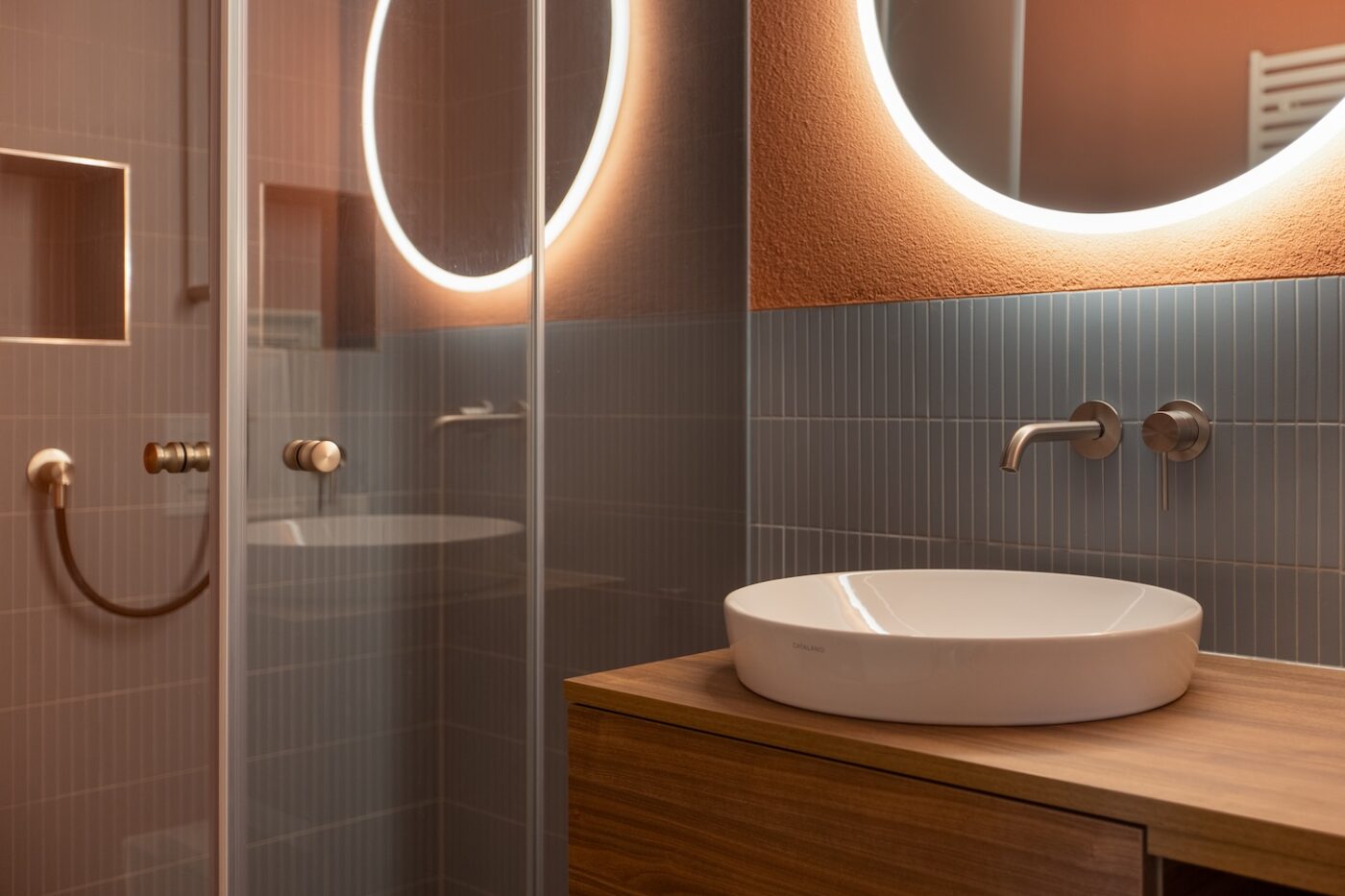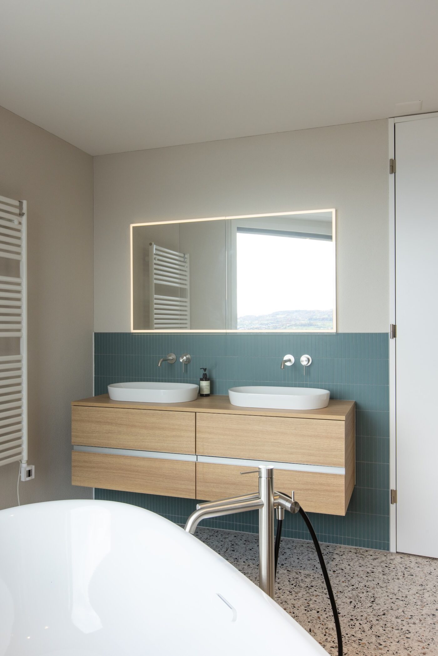 Als unabhängige Beraterin und Designerin habe ich mich, auf Empfehlung des Architekten, mit der Bauherrschaft für ein Gespräch inkl. Wohnstil-Evaluation getroffen. Mein Design-Konzept umfasste die Küche, das Attika- und das Gästebad sowie die Farbgestaltung der Wände. Gemeinsam haben wir das Küchenlayout sowie die Einteilung der Möbel definiert und eine reduzierte Selektion an Muster und die 3D Visualisierungen halfen der Bauherrschaft bei der Auswahl der finalen Materialien, Oberflächen, Armaturen und Geräte. Auch die Bäder wurden komplett von mir bemustert, so dass die Bauherrschaft keine weitere Ausstellung besuchen musste.