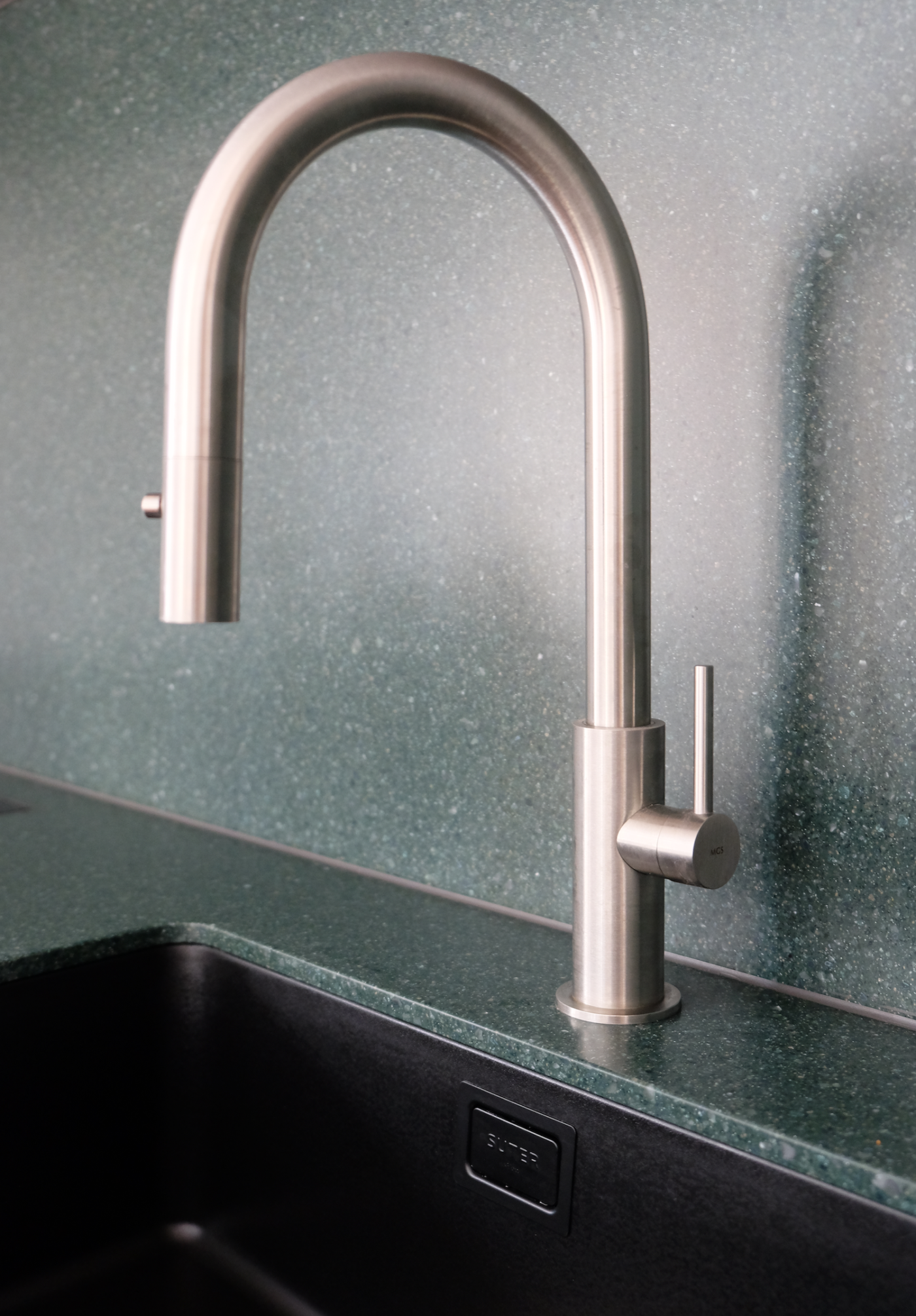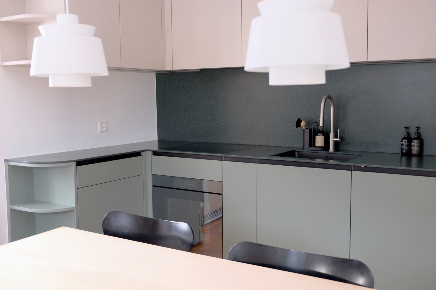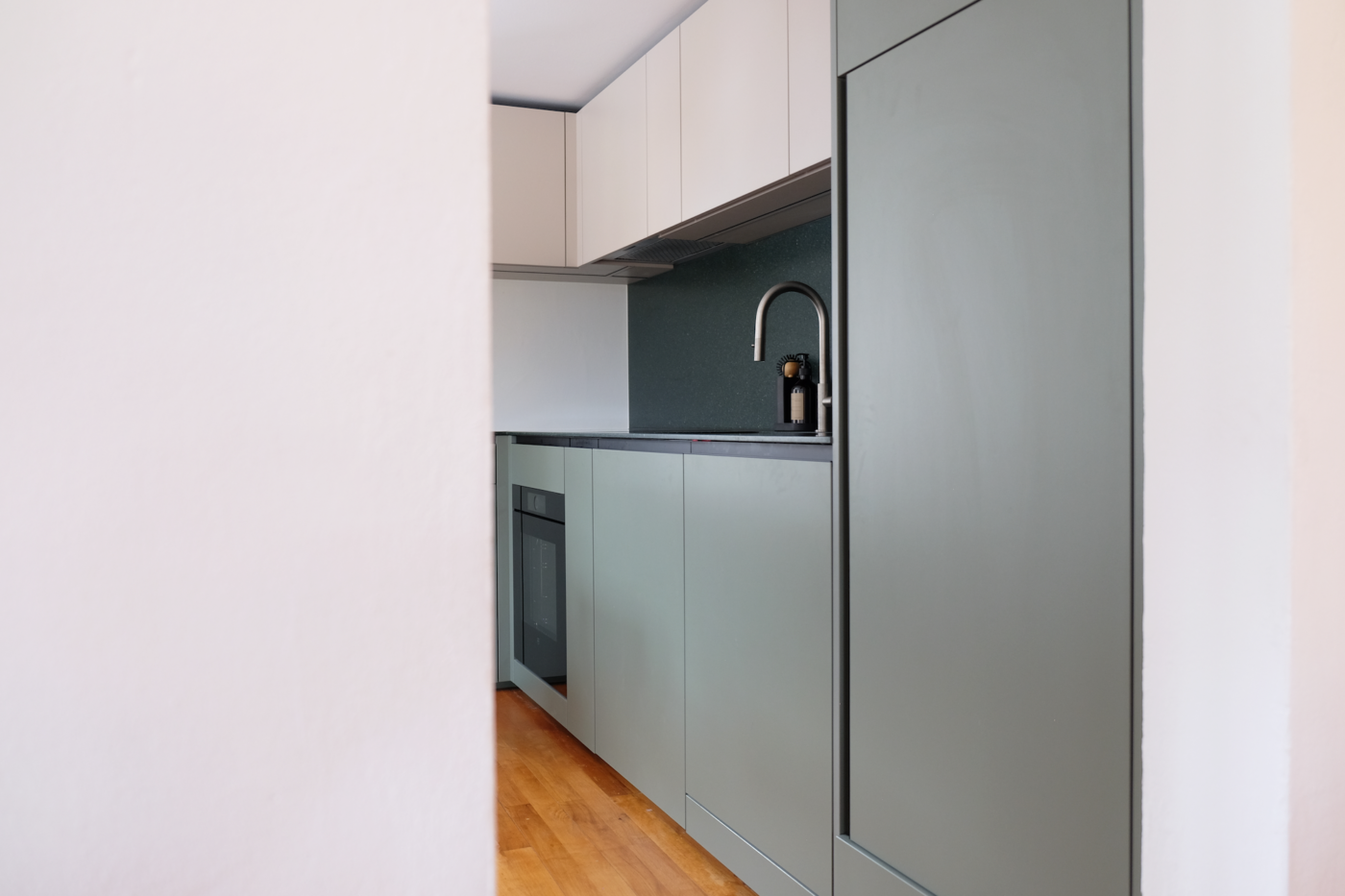 Die gut erhaltene, aber nicht mehr zweckgemässe Forster Küche wurde durch eine hochwertige Schreinerküche ersetzt. Mit einer zusätzlichen schmalen Küchenzeile konnte die Ablage vergrössert werden, so dass mehr Rüstplatz und ein Platz für die Kaffeemaschine zur Verfügung stehen.